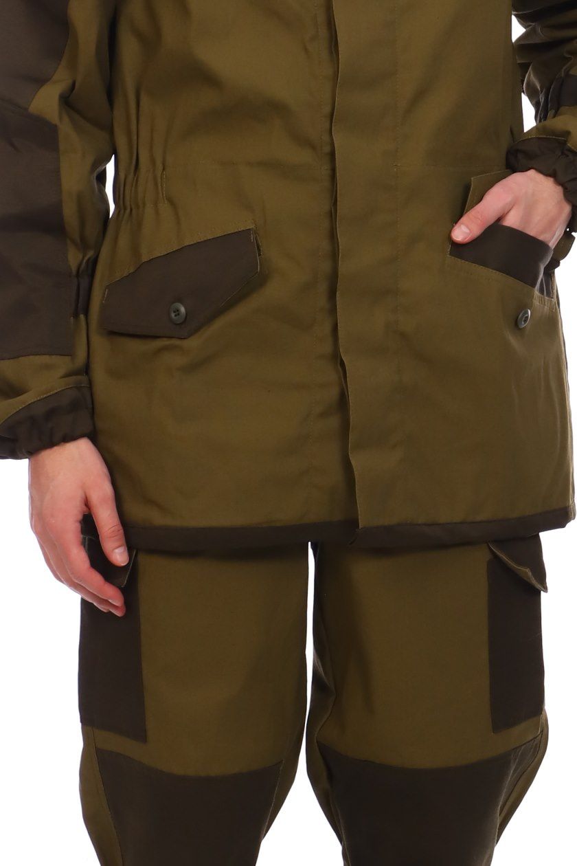 ➠ Куртка прямого кроя, с супатной бортовой застежкой на пуговицы и капюшоном пристегивающимся на пуговицы. На полочках наклонные прорезные карманы с клапаном застегиваются на пуговицы. По линии талии расположена кулиса собранные на эластичную ленту. Рукава с налокотниками, над которыми расположены накладные карманы с клапанами фиксирующиеся на контактную ленту, с манжетами. Карман на внутренней подкладке левой полочки.