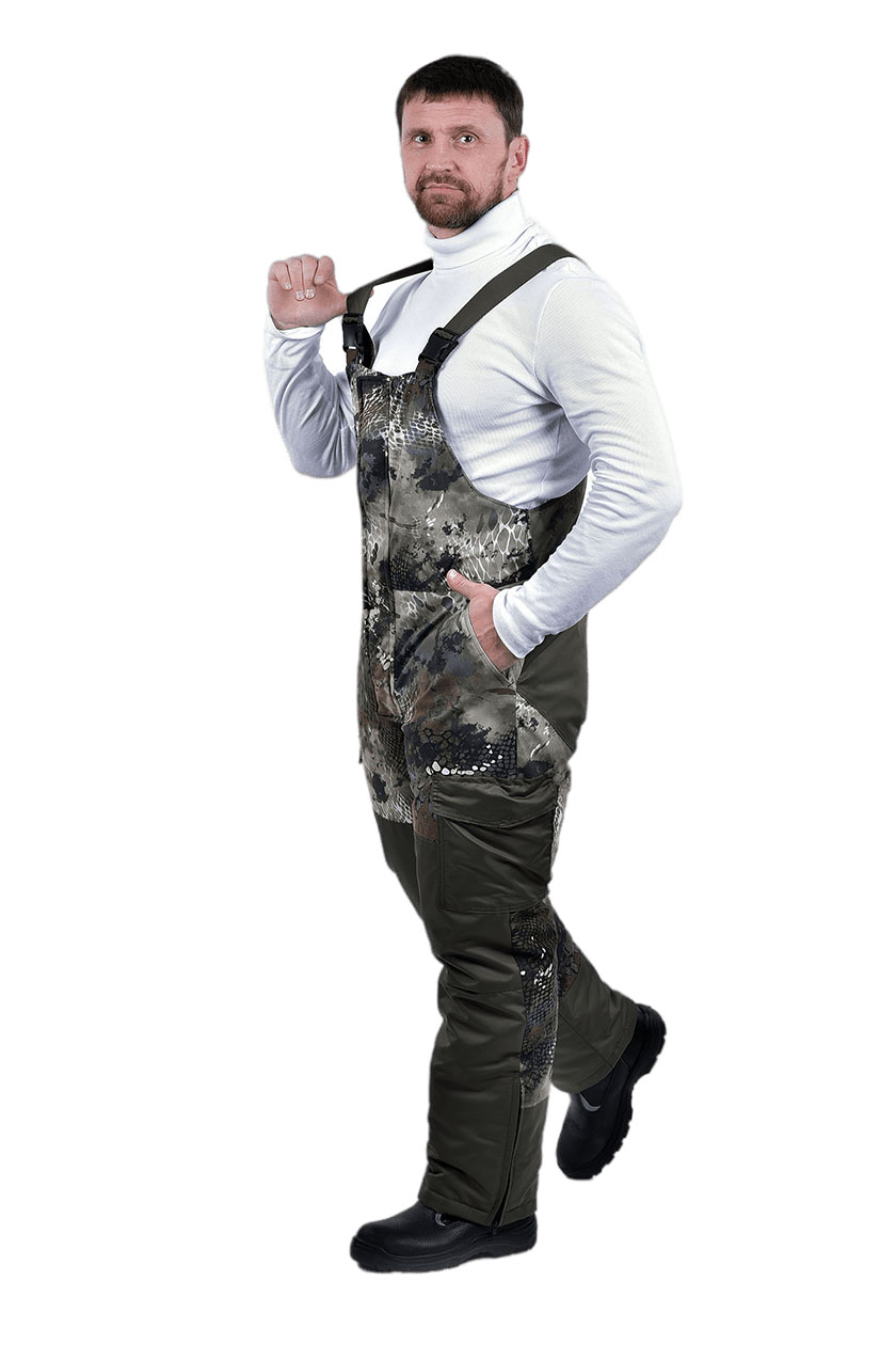 ➠ Комбинезон: высокий пояс со съемной спинкой, на бретелях. Застежка гульфика на молнию, на поясе — пуговицы. На передней части брюк карманы с отрезным бочком, по боковыми швам в области колена накладные карманы с фигурным клапаном на липучке. Наколенники переходящие в манжеты на резинке, по линии колена кулиса. По низу брюк внутренние манжеты на резинке, со штрипками.