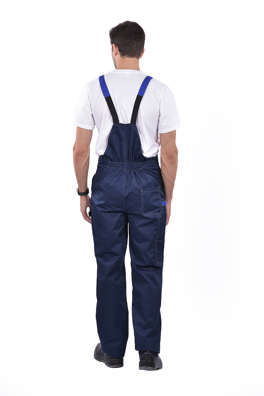 ➠ Полукомбинезон: застежка в правом боковом шве на пуговицу, в среднем шве — на «молнию». Карман с клапаном на грудке, боковые карманы с отрезным бочком. Один карман над левым наколенником. Колени усилены накладками, заложены по 2 вытачки.