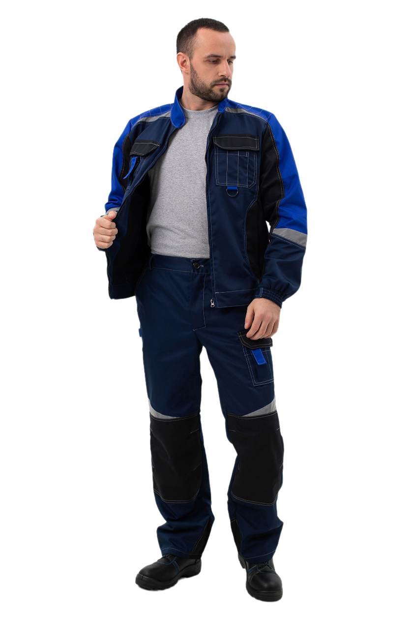 ➠ Брюки: на притачном поясе, гульфик с застежкой на «молнию», боковые карманы с отрезным бочком. Колени усилены накладками, заложены по 2 вытачки. Один карман над левым наколенником. По шву наколенников косые, фигурные вставки СОП.