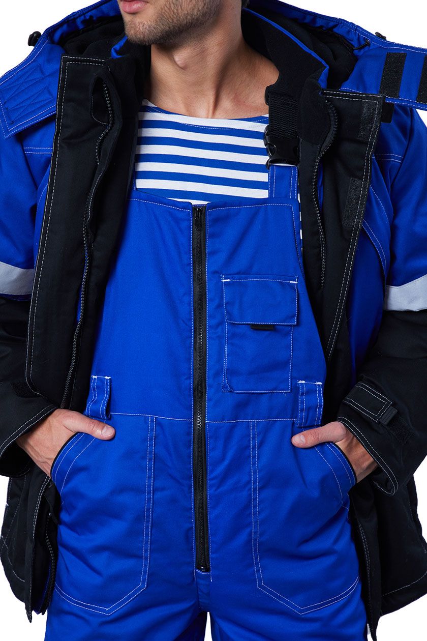 ➠ Полукомбинезон утеплённый отрезной по линии талии. Застежка спереди на тесьму «молния», в левом боковом шве на кнопки. На грудке накладной карман с клапаном. На передних половинка накладные карманы с наклонным входом. В области колен усилительные накладки с вытачками. СОП 50 мм проходит вкруговую по низу полукомбинезона.