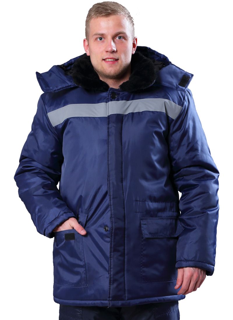 Куртка утепленная с центральной супатной застежкой на пуговицы. Воротник отложной из искусственного меха. Два нижних накладных кармана с клапанами. Рукава с трикотажными манжетами. Капюшон съемный на пуговицах. По линии талии расположена кулиса. СОП 50 мм расположен по шву притачивания кокеток.
