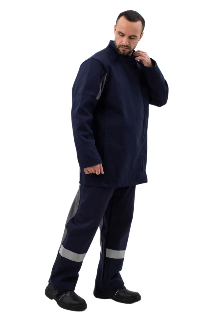 Оптимальный объем костюма исключает излишние заломы ткани и попадание в них искр и брызг. Отделочные строчки выполнены огнестойкими нитками.